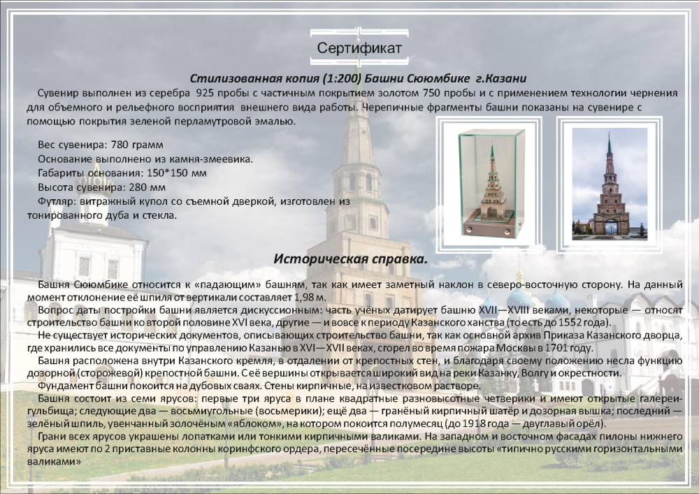Наименование: Стилизованная копия (1:200) Башни Сююмбике г. Казани.