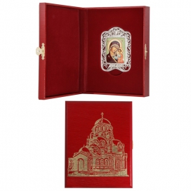 Сувенир укладывается в футляр выполненный из материала "pellaq" красного цвета. На крышку футляра золотым тиснением нанесено изображении Собора Богоматери Всех Скорбящих Радости (Свияжск).