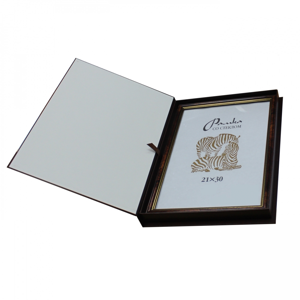 В футляр укладывается деревянная рамка с золотистым обрамлением.